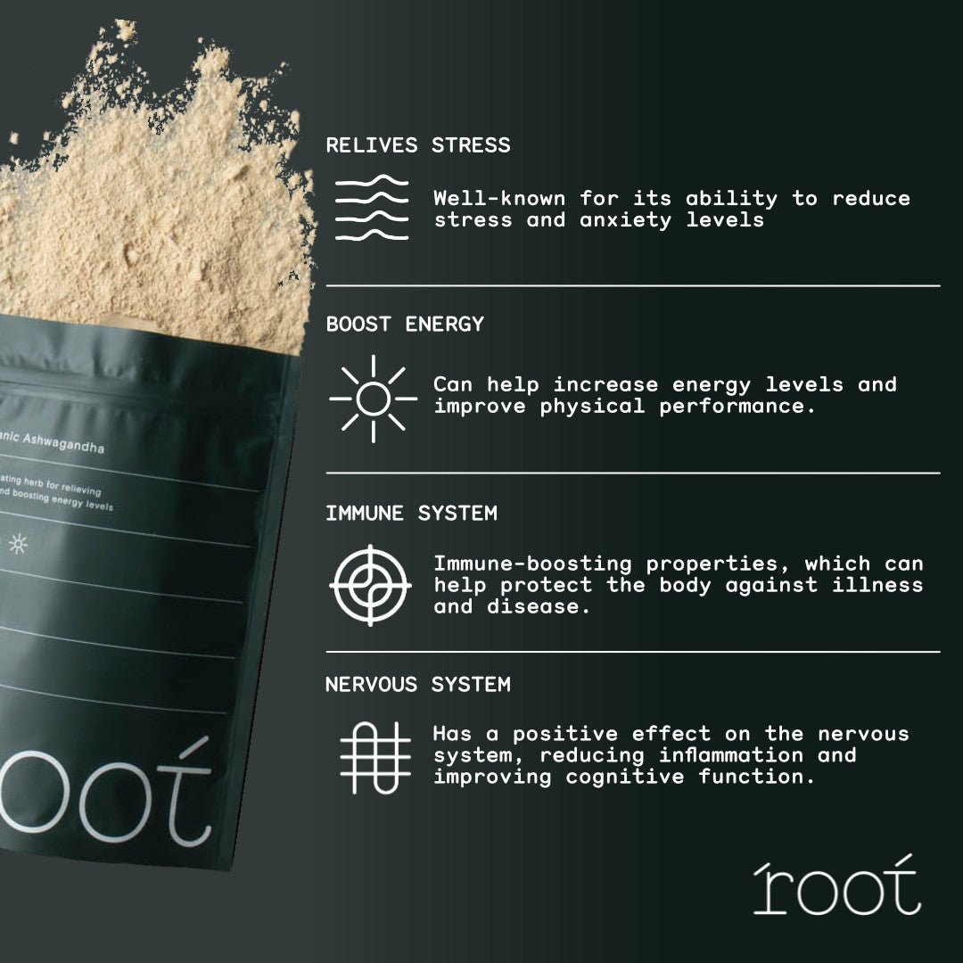 Here are some of the key benefits of Root's organic Ashwagandha powder: